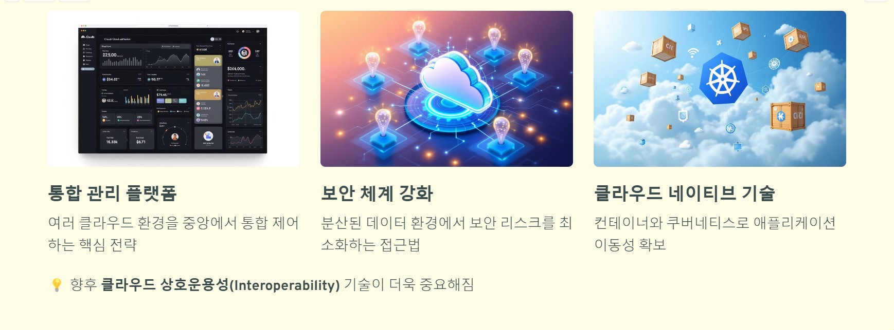 - 통합 관리 플랫폼 도입: 여러 클라우드 환경을 중앙에서 제어할 수 있어야 합니다.