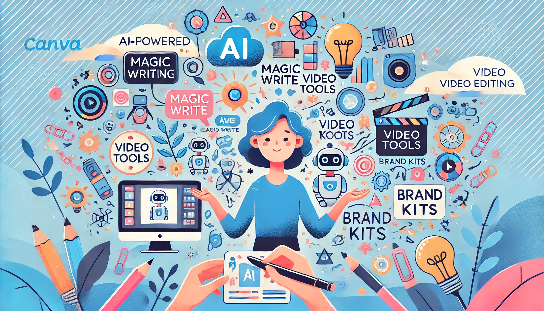 Magic Write는 AI가 소셜 미디어 캡션, 블로그, 광고 문구 등 텍스트를 자동으로 생성해주는 기능입니다. 또한 자동화 도구를 통해 마케터와 교육자를 위한 대량 작업과 반복 업무를 최소화할 수 있으며, 팀 단위 브랜드 관리 기능을 통해 로고, 폰트, 컬러 팔레트 등 브랜드 자산을 자동으로 통제할 수 있습니다. :contentReference[oaicite:5]{index=5}