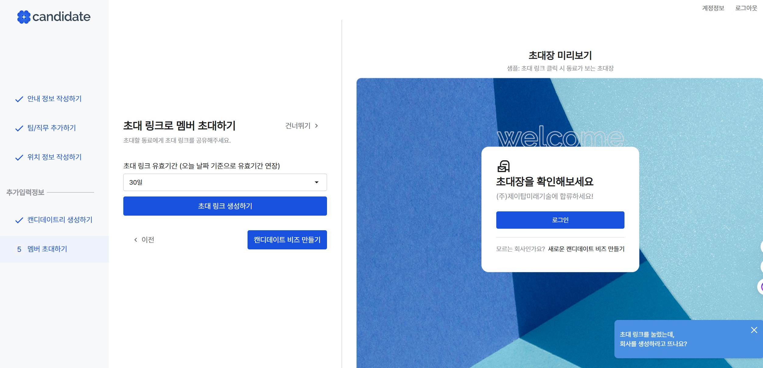 - 원하는 서비스(캔디데이트 비즈) 선택 및 신청서 작성