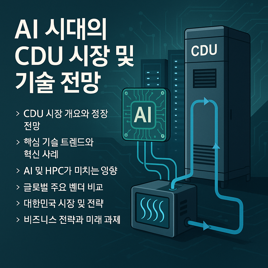 쿨런트 분배 장치(Coolant Distribution Unit, CDU)는 데이터 센터 내 컴퓨팅 장비의 열을 효율적으로 제거하는 액체 냉각 시스템의 핵심 구성요소입니다. AI, 머신러닝, 고성능 컴퓨팅(HPC)과 같은 첨단 기술의 발전으로 인해 발생하는 고밀도 열 부하를 관리하기 위해 CDU 시장은 급속도로 성장하고 있습니다. 이 보고서는 AI 시대에 CDU 시장의 현황, 성장 요인, 주요 기술 동향, 시장 규모 및 향후 전망에 대해 분석합니다.